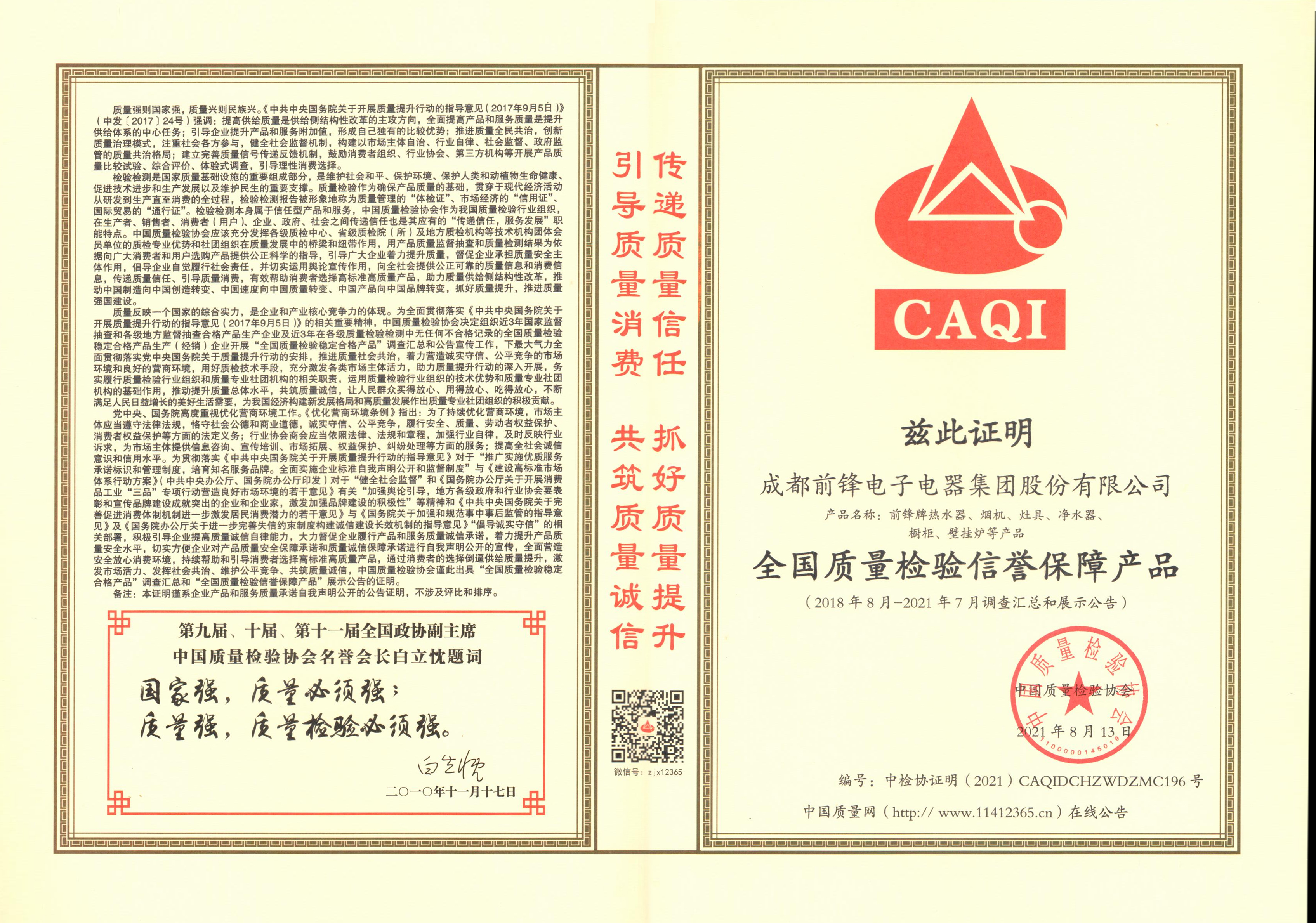 “全國質(zhì)量檢驗(yàn)信譽(yù)保障產(chǎn)品”榮譽(yù)證書